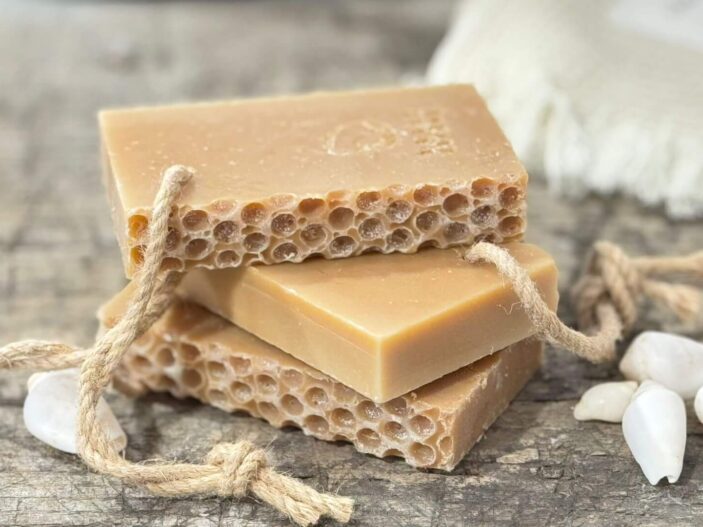 סבון דבש basic עם חבל: מראה טבעי, אחיזה נוחה וייבוש יעיל בזכות החבל. אידיאלי לשימוש במקלחת ולטיפוח העור.